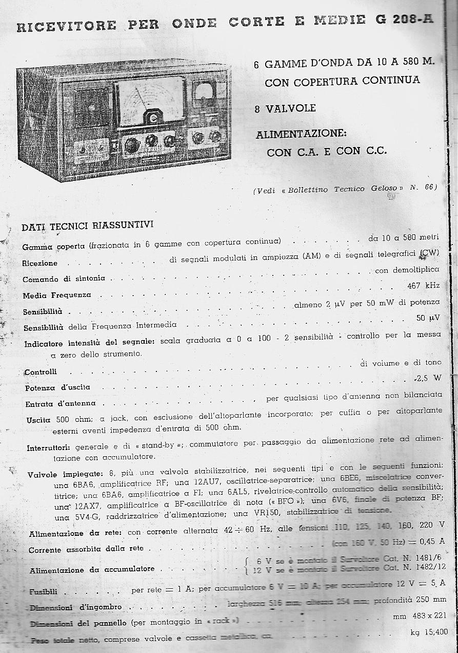 Geloso G-208A specifications (Italian)
