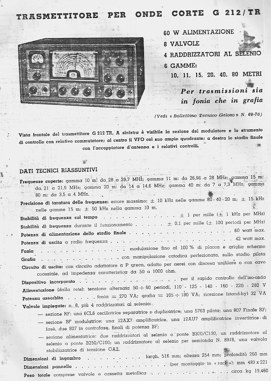Geloso G-212TR specifications (Italian)